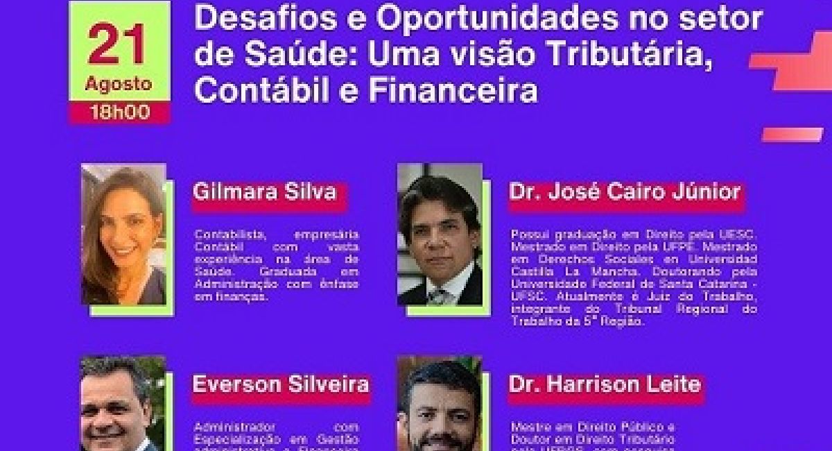 No primeiro dia do encontro, uma mesa redonda vai abordar a temática “Desafios e oportunidades no setor de saúde: uma visão tributária, contábil e financeira”, com multiprofissionais, entre eles, Gilmara Silva, José Cairo Júnior, Everson Silveira e Harrison Leite, todos especialistas na área.
